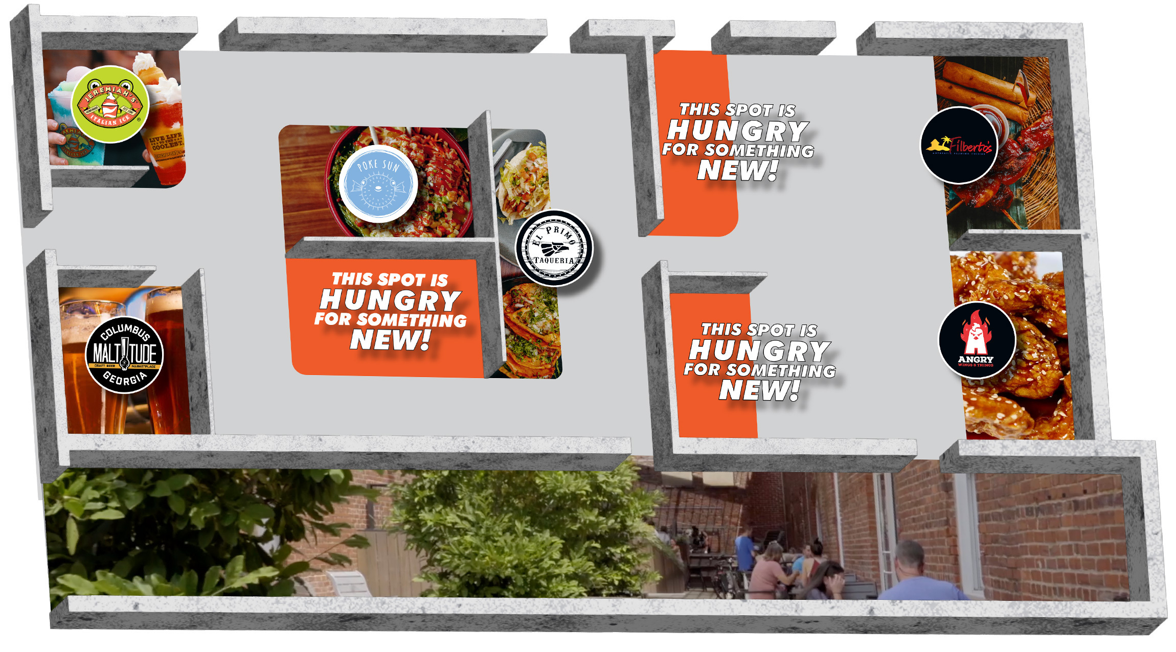 A curated mix of local favorites serving up everything from tacos and wings to frosty treats and craft beverages. - Indoor & Outdoor Seating